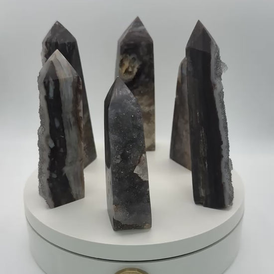 These Black Druizy Agate Point display deep black tones with sparkling druizy surfaces and subtle natural banding, each polished into a unique point that highlights their glittering crystal textures.