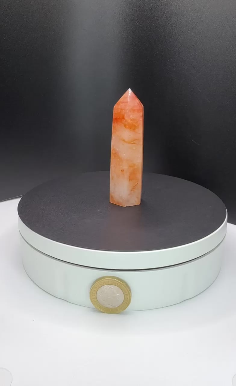 This Fire Quartz Tower shines with fiery reddish and orange inclusions dancing within clear quartz. Polished into a stunning sleek point.