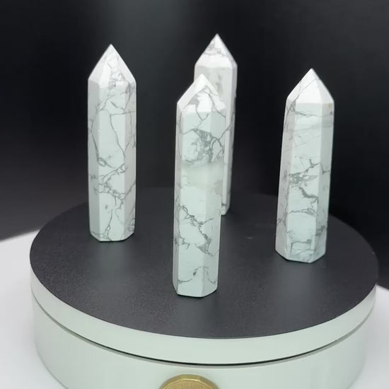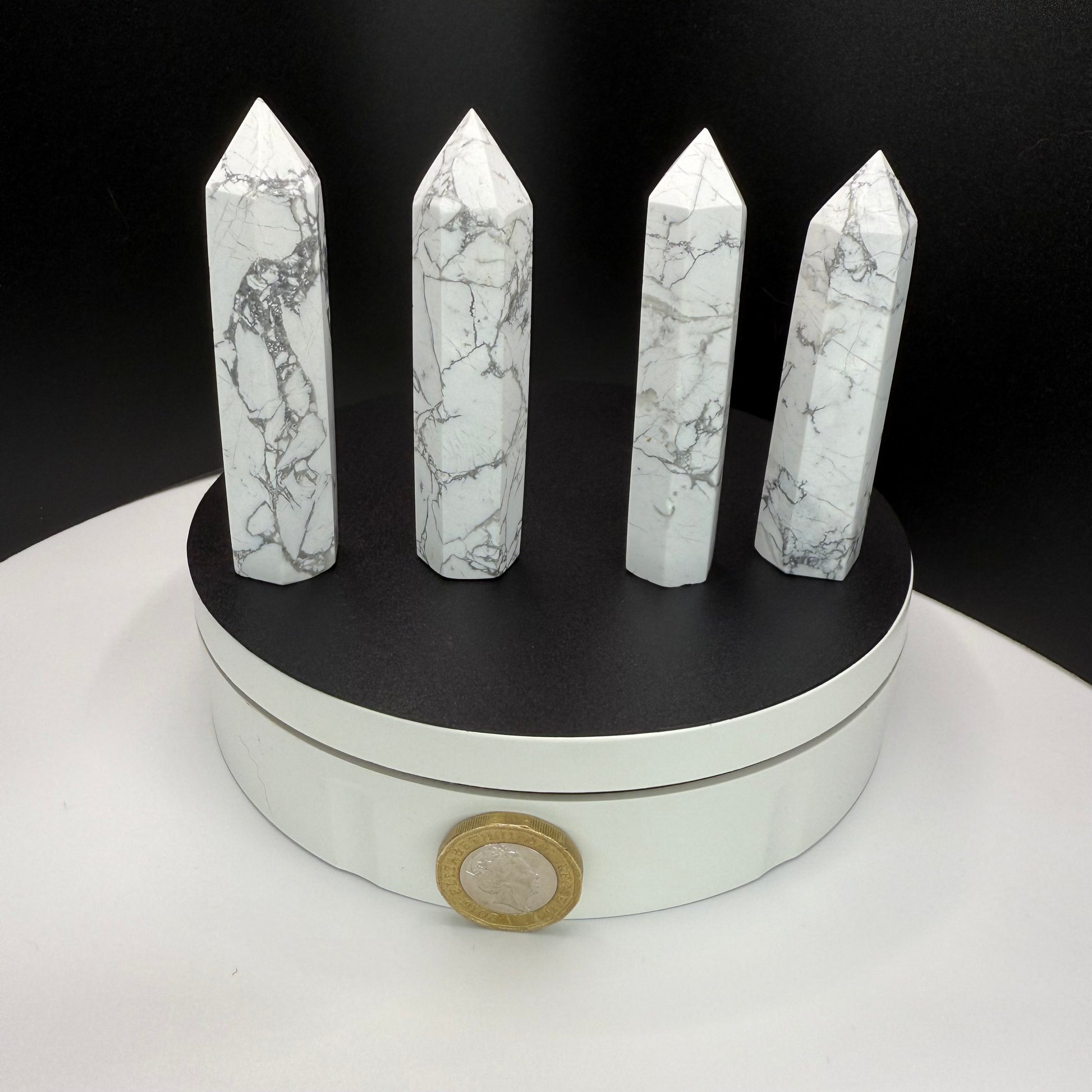These Howlite Towers shine with a pure white base beautifully laced with natural grey veining. Polished into a sleek point.