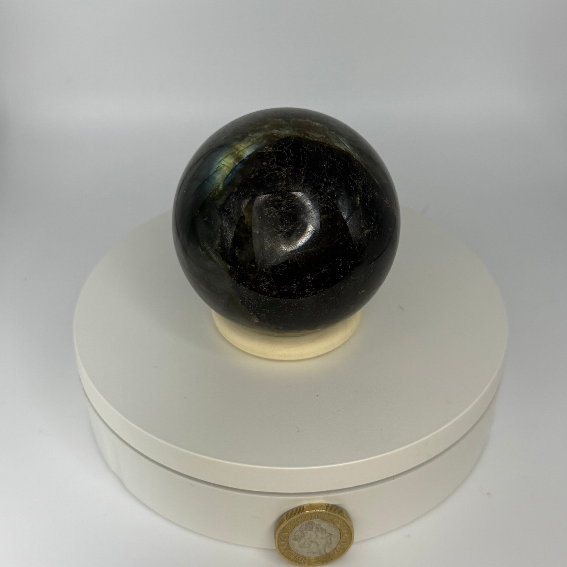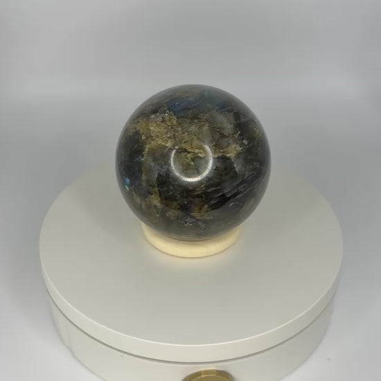 Flashes of electric blue, teal and hints of gold shimmer across the dark surface of this Labradorite Sphere, polished to a smooth finish that reveals its striking natural iridescence.